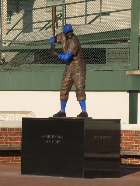 Ernie Banks' bronze statue returned to Wrigley Field today after a week of restoration, and boy does it look spiffy. Apparently the likeness of Mr. Cub was starting to turn green prematurely so they did what they had to do. For good measure they also brightened up the blue accents that were much more subtle when unveiled back in March of '08. That bright blue now matches Ronnie Santo over on Addison.